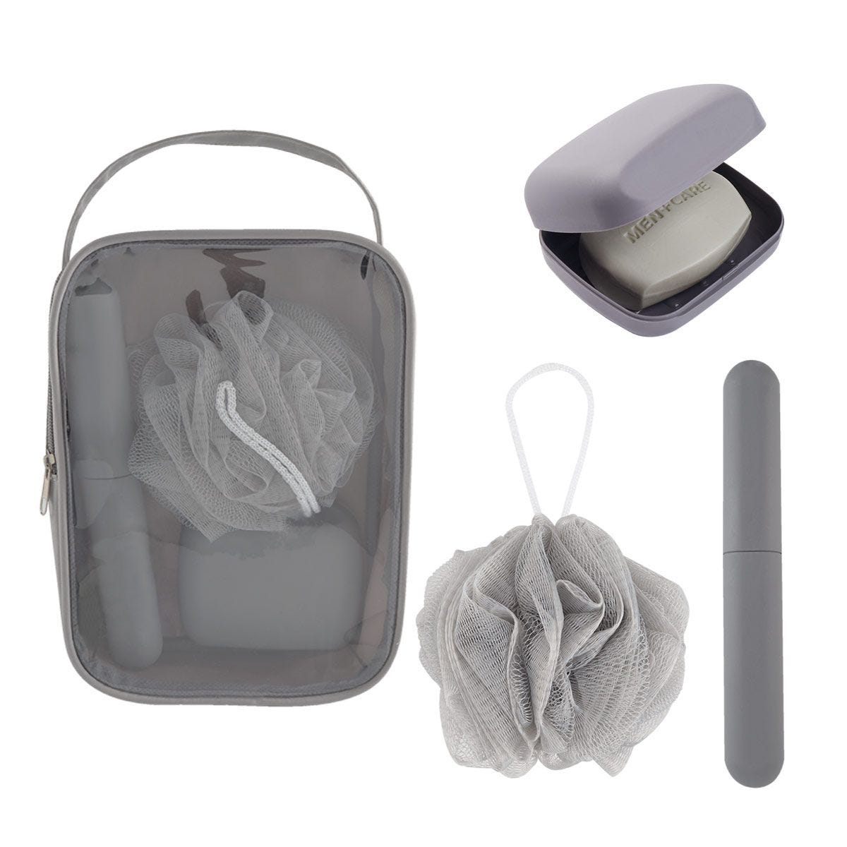 Incluye 3 accesorios de baño: esponja, estuche para jabón y cepillo de dientes.