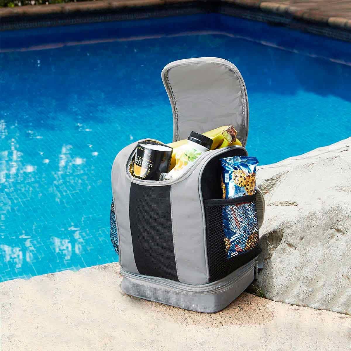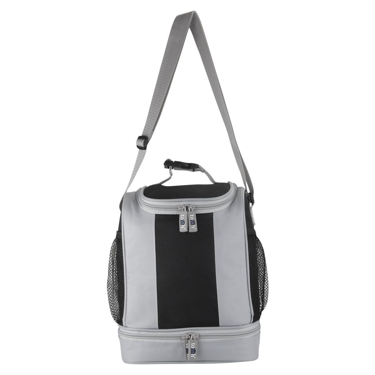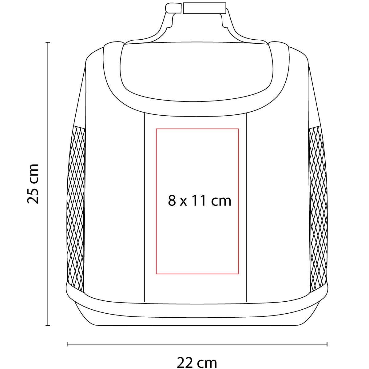 Interior plastificado. Cuenta con compartimentos superior e inferior. Incluye bolsas laterales de red, asa con broche y correa ajustable.