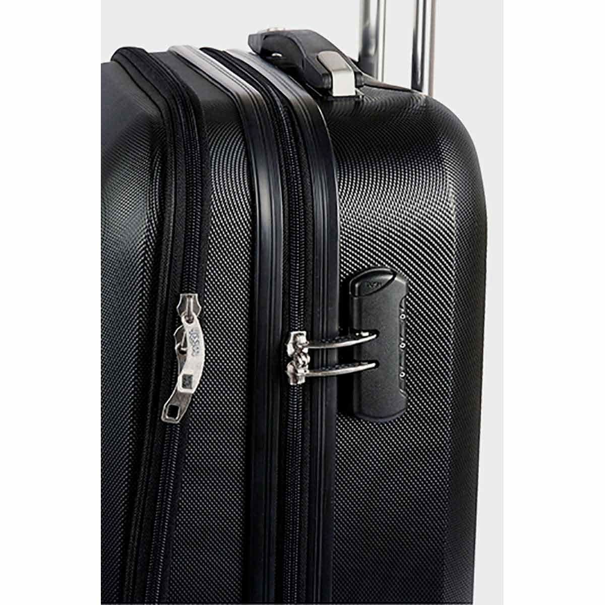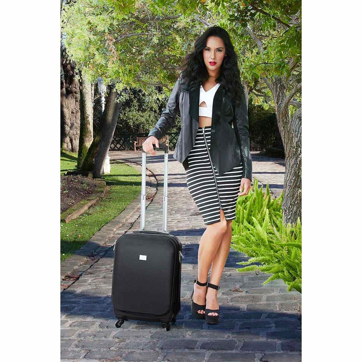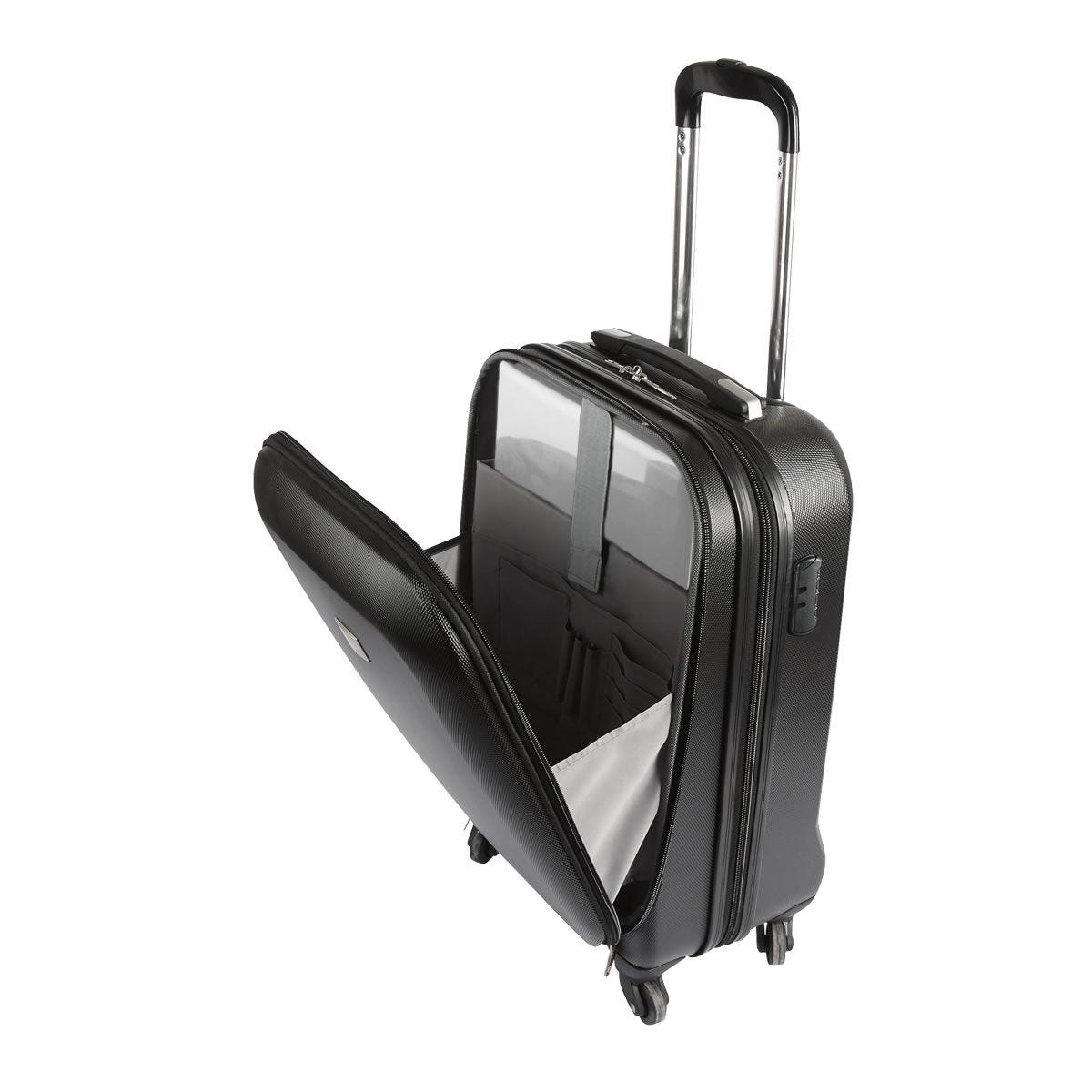 Maleta trolley con 4 ruedas. Cierre frontal con espacio para laptop y organizador de documentos. Cierre principal con 2 compartimentos internos. Placa metálica removible para fácil grabado y candado de seguridad con combinación de 3 dígitos.