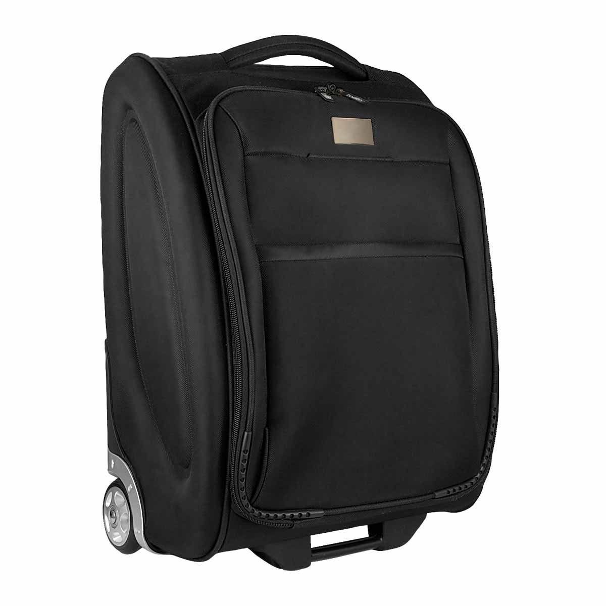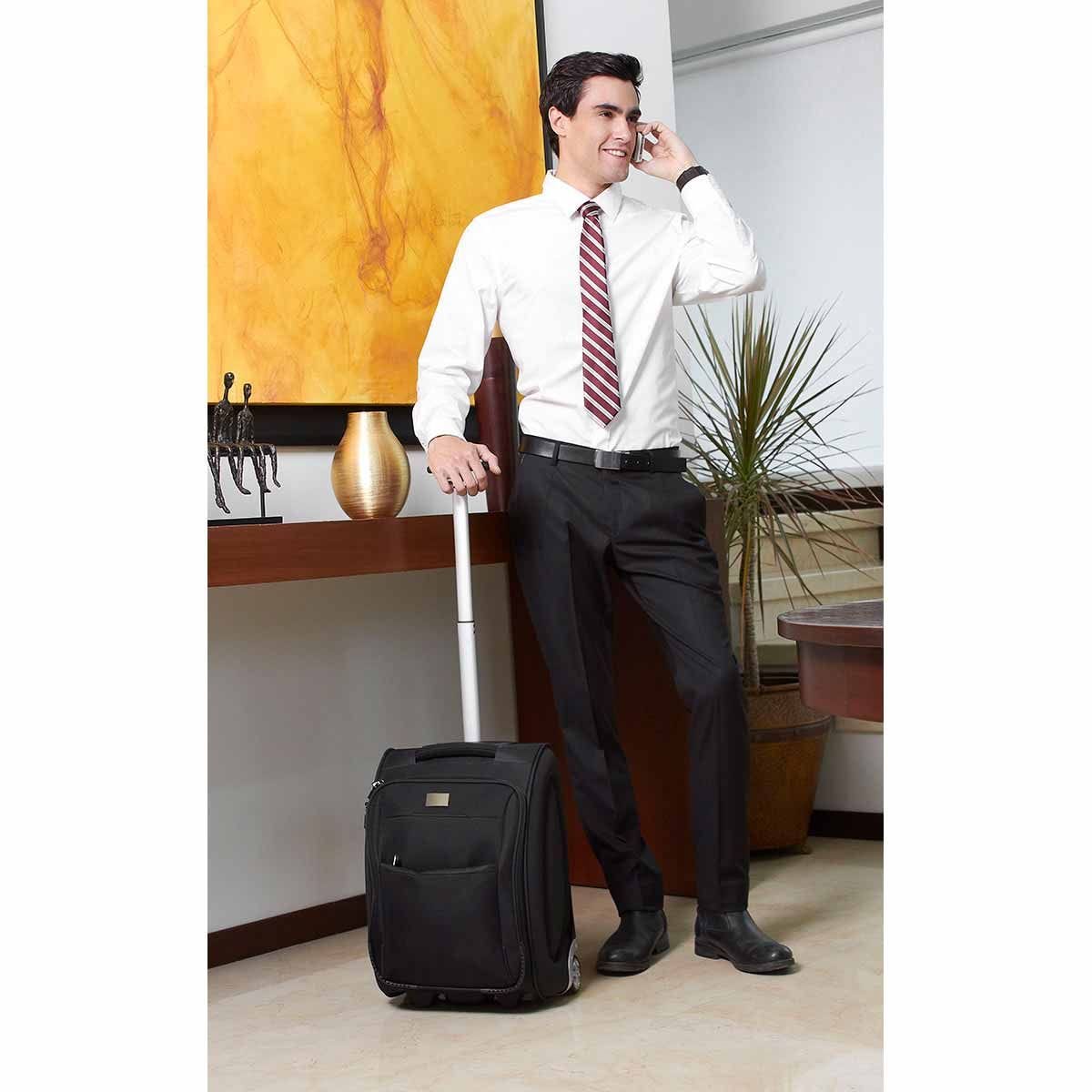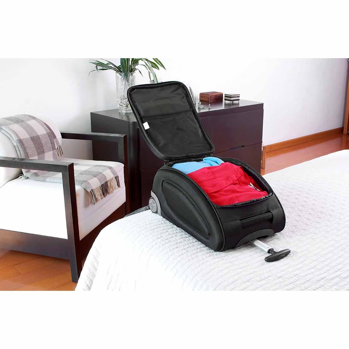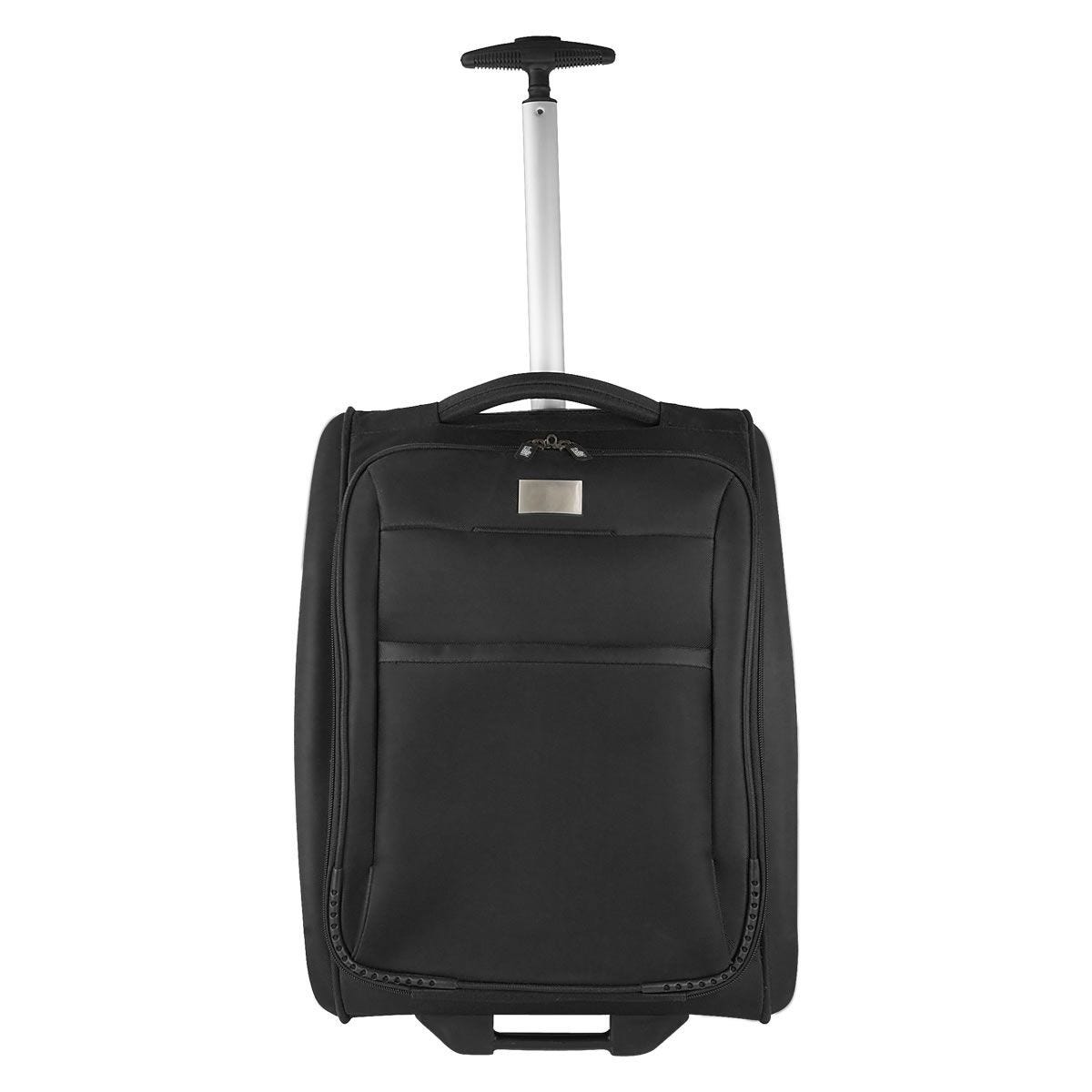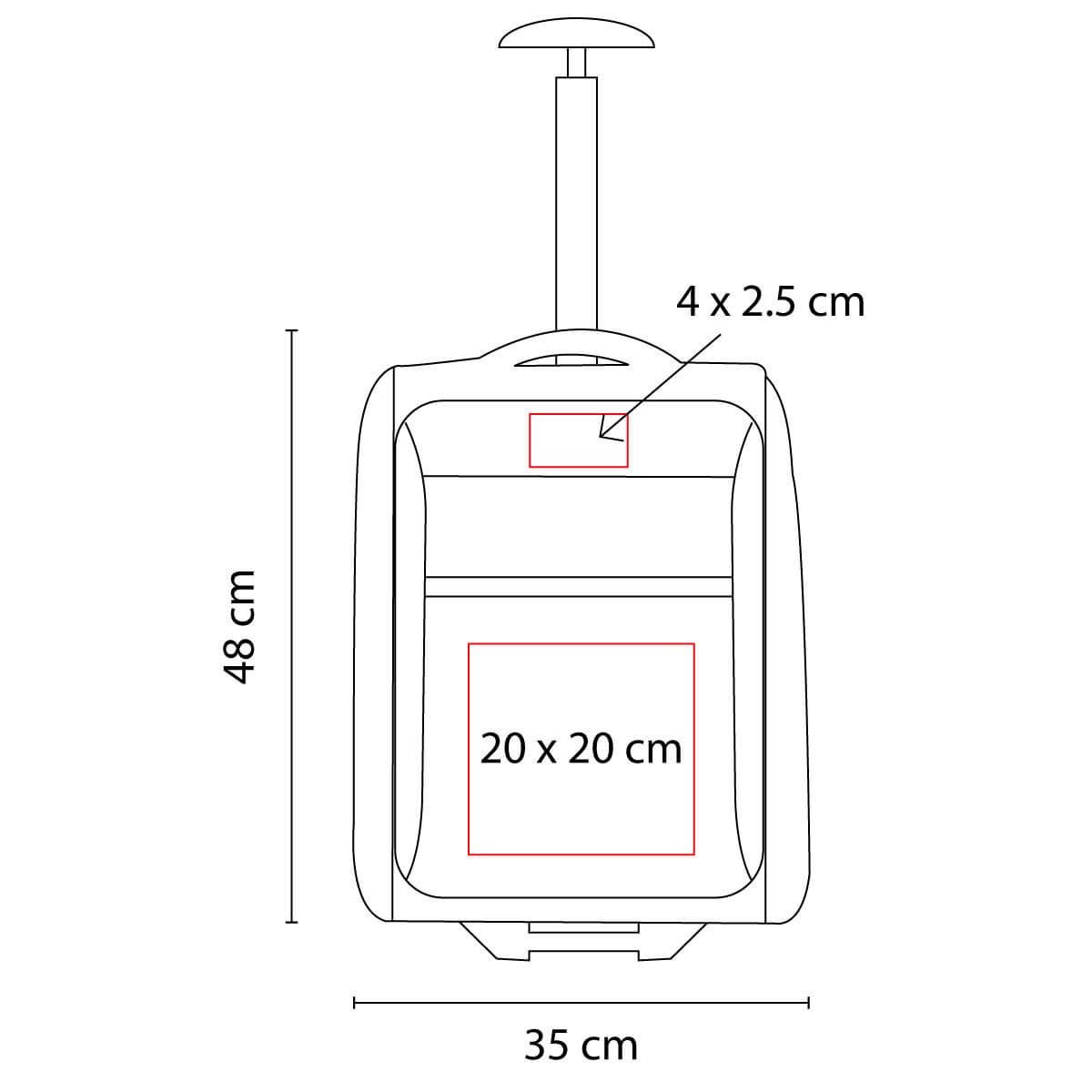 Maleta trolley con 2 ruedas. Compartimento principal y compartimento interno con bolsa de red con cierre. Bolsa frontal con cierre y placa removible para fácil grabado.