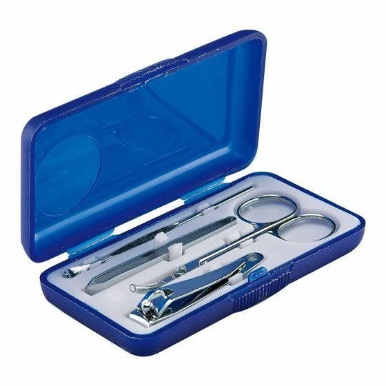 Set con 1 tijeras, 1 pinza para cejas, 1 corta uñas y 1 retira cutícula.
