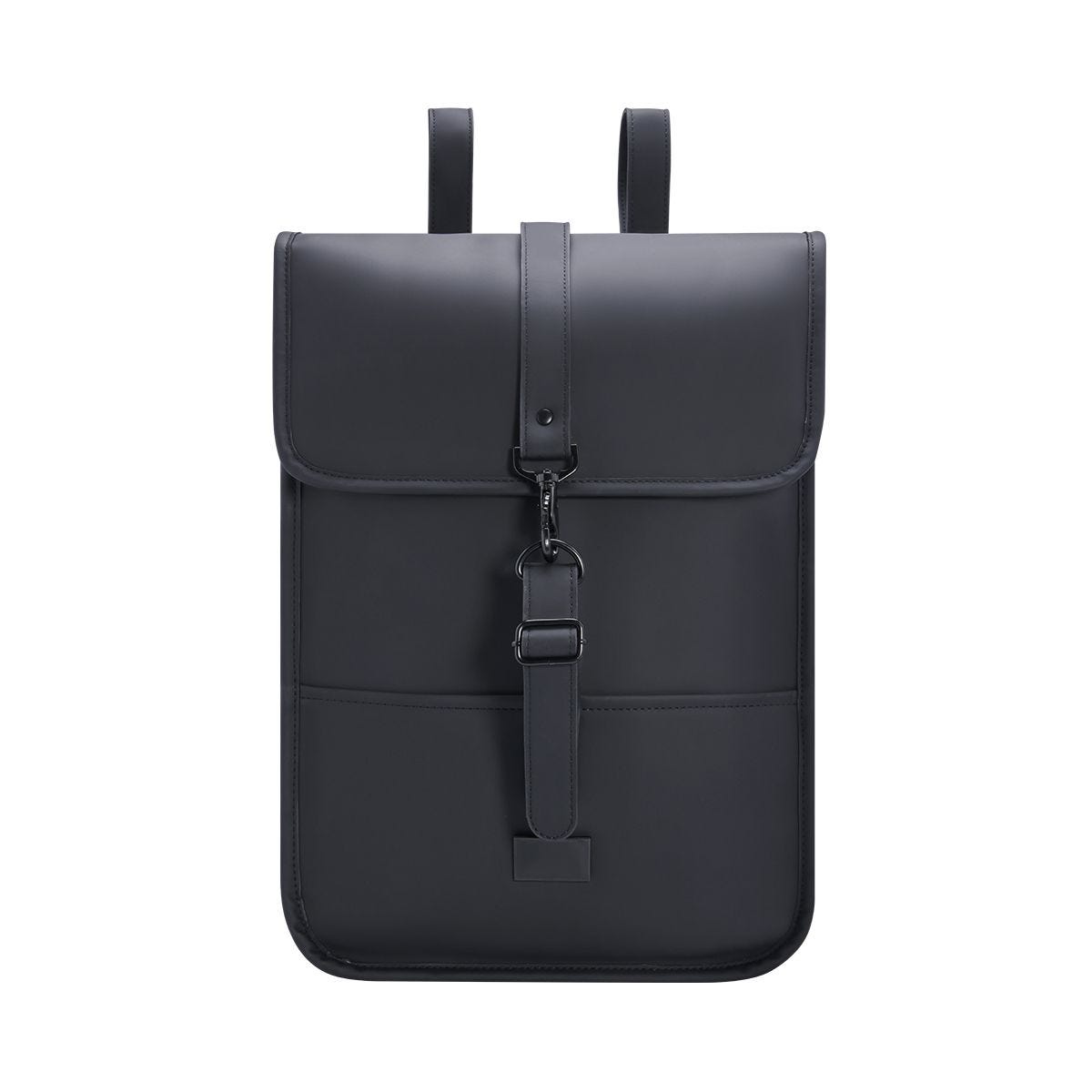 Bolsa principal con cerrado de broches magnéticos y gancho con correa ajustable, compartimento interior acolchado para laptop, cierre invisible para acceder o remover fácilmente placa metálica.