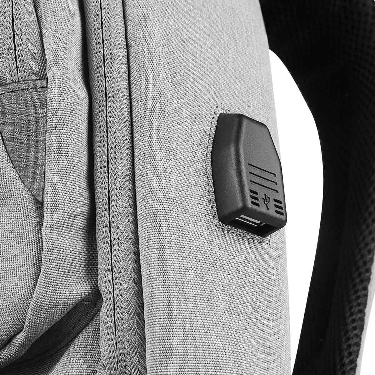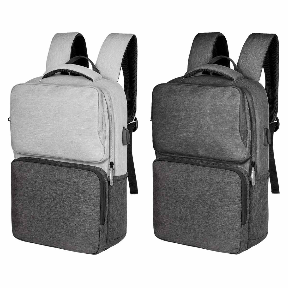 Mochila con salida USB (se requiere conectar a batería portátil) para cargar smartphone. Bolsa principal con cierre interno y compartimento para laptop y tablet. 2 Bolsas frontales con cierre, 2 bolsas laterales y tirantes acojinados.