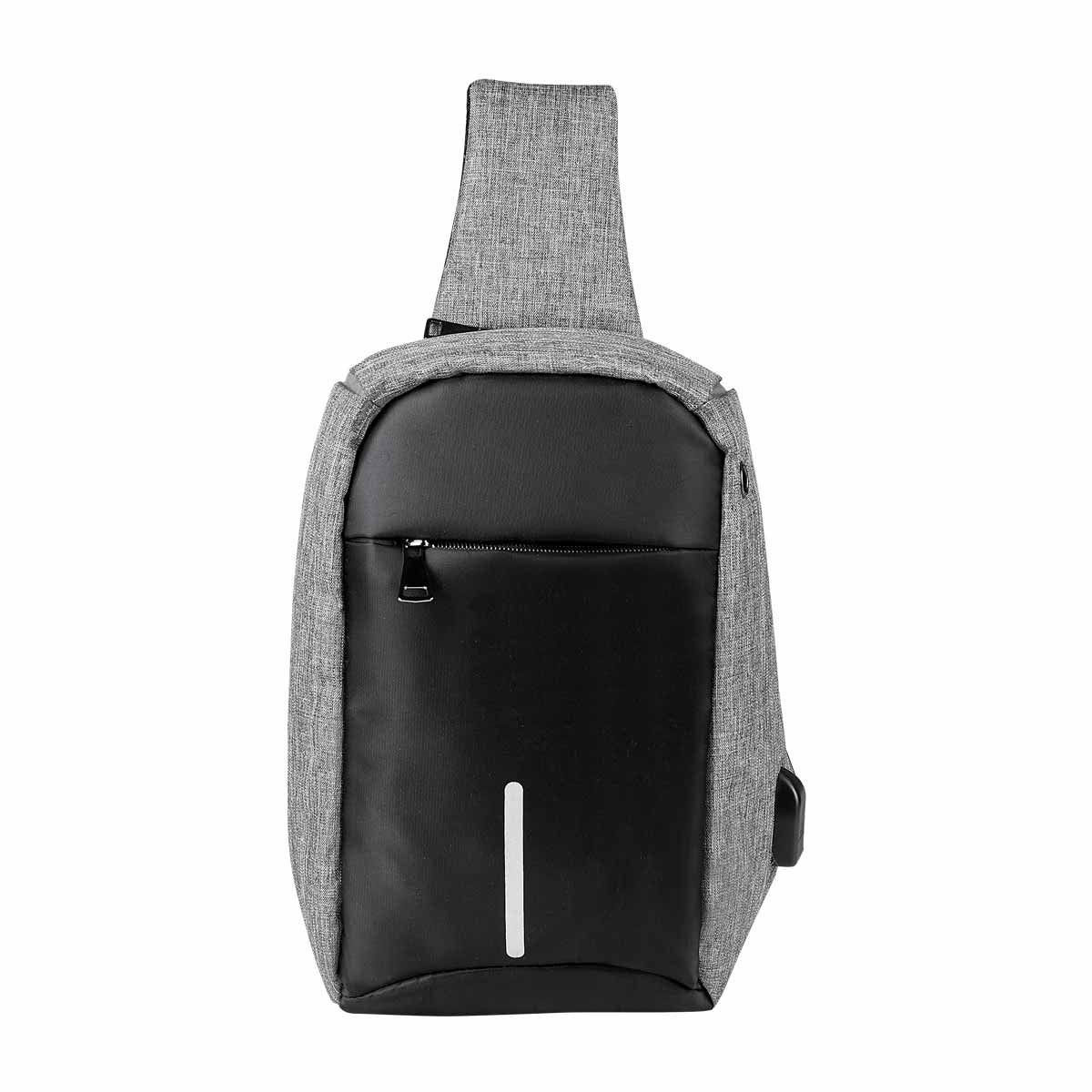 Bolsa frontal y trasera con cierre oculto. 1 Compartimento interno. Incluye correa ajustable con un asa. Tirante y respaldo acojinado con cierre para llaves. Incluye puerto USB (se requiere conectar a batería portátil) para cargar smartphone. Batería portátil no incluida.