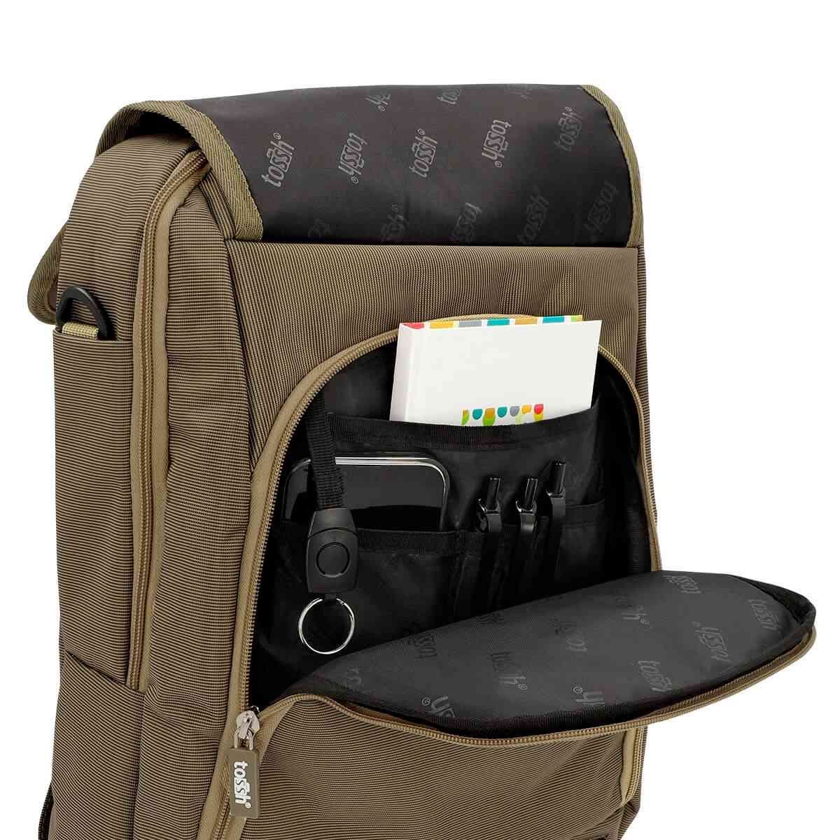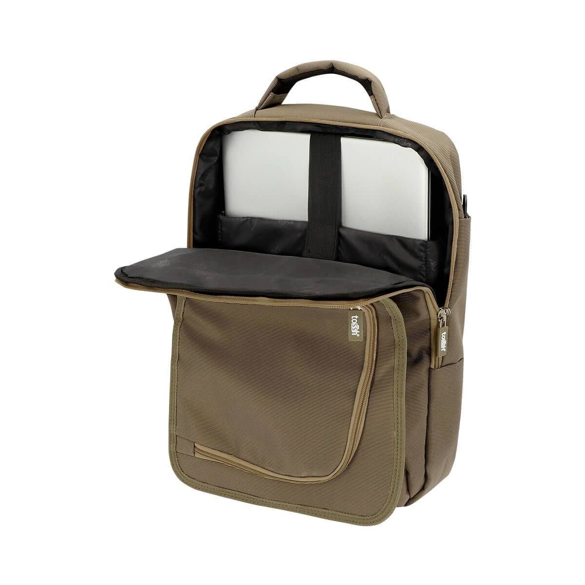 Mochila-portafolio. Bolsa principal con compartimento para laptop. Bolsa con organizador de documentos. Bolsa frontal con cierre, respaldo y tirantes acojinados. Correa ajustable.