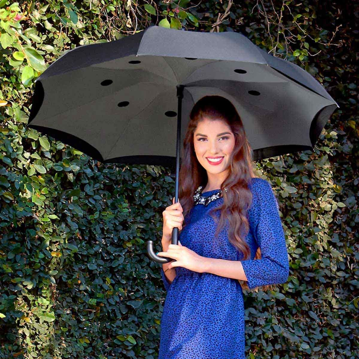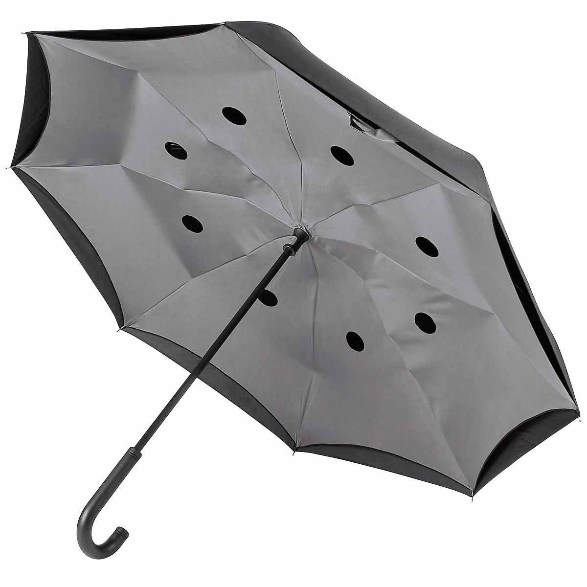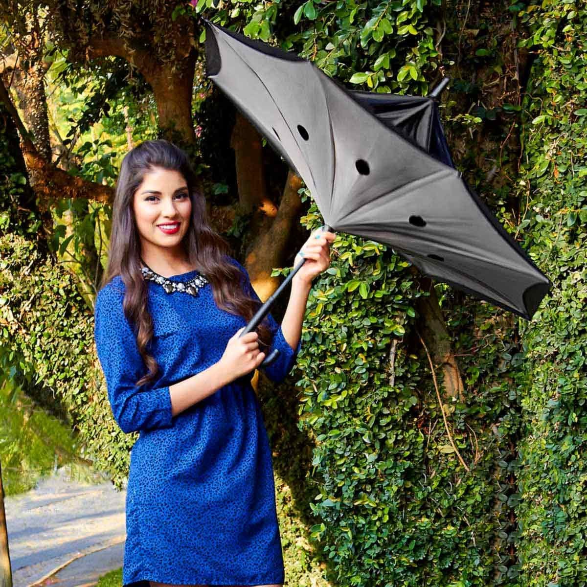 Paraguas reversible. Manual, 8 paneles dobles y mango de plástico. Incluye funda con correa.